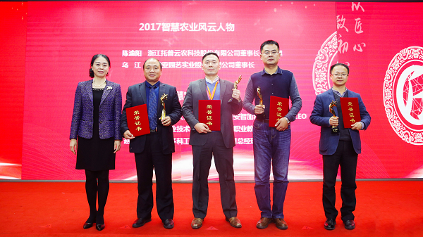 圖:托普云農董事長陳渝陽獲得2017 智慧農業風云人物證書位列其中
