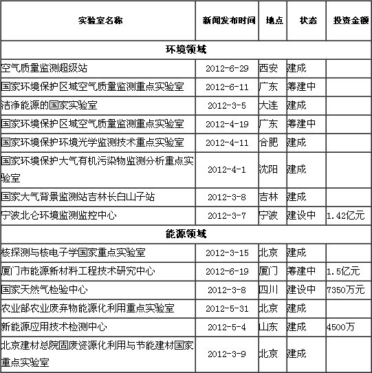 在這四十五家的實(shí)驗(yàn)室中,糧油儀器網(wǎng)發(fā)現(xiàn)有多家制造商廠商斥巨資設(shè)立研發(fā)中心,以下為2012年上半年我國(guó)環(huán)境、能源及其他領(lǐng)域的實(shí)驗(yàn)室建設(shè)情況: