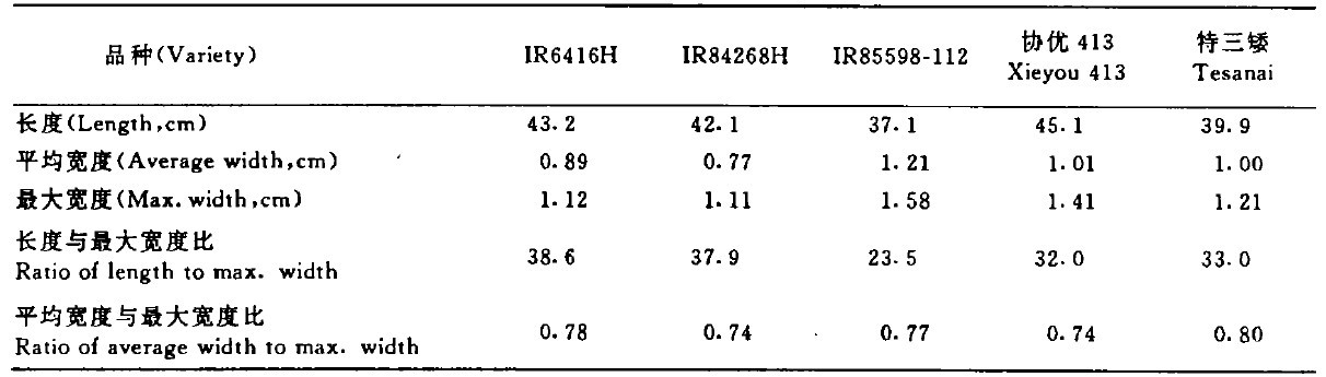 根據各品種葉片長度與最大寬度比值(長寬比),可把本試驗供試品種分為三種類型:1.國際稻傳統類型,IR64一6H和IR84268H的葉片長寬比值在38一39,葉片較長而窄。2.國際水稻研究所提出的新株型,IR89558一112的葉片長寬比值為23.5,葉片長度適中,較寬。3.二個中國品種(協優413和特三矮)葉片長寬比值為32~33,葉片較長且尚寬或葉片長寬適中。雖然葉片平均寬度和最大寬度與葉片長寬比呈現相似的變化趨勢,但不同品種葉片平均寬度與最大寬度比值有一定差異(表1)。這一比值反映了葉片寬度在整個葉片上的變化大小。