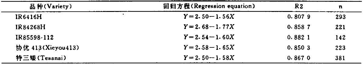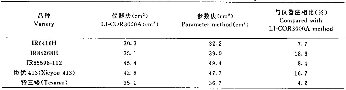 用葉面積測定儀的儀器和參數法測量了約1500張葉片面積的結果,表明用此二法測得的葉面積值在不同品種中均表現為參數法測值高于儀器測值(表2),這說明參數法計算中所用的1.2系數偏小。二者間的差異因葉片葉形的差異存在很大的差異,以IR84268H和協優413差異最大,達17%~18%,IR6416H和IR89558一112差異為8%左右,特三矮為4.2%。