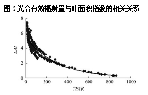 通過光合有效輻射計的研究分析,并結合表1表明,生育期內不同處理的光合有效輻射量具有相同的變化趨勢,均呈倒拋物線形,即隨著小麥生育進程逐漸減小,抽穗期達到最低點,隨著成熟期小麥生長的減弱,光合有效輻射量逐漸增大,光合有效輻射量隨著播期的推遲逐漸增大,光合有效輻射量的動態變化與葉面積指數呈相反的趨勢。圖2是不同播期小麥各生育期光合有效輻射量與葉面積指數的相關關系圖,光合有效輻射量與葉面積指數負相關,經顯著性分析,為極顯著負相關。